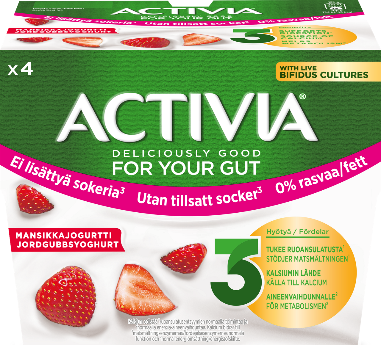 Activia mansikkajogurtti ei ainoastaan sisällä 4 miljardia elävää bifidobakteeria, vaan on myös täyteläisen pehmeä, maukasta mansikkaa sisältävä herkullinen jogurtti.
