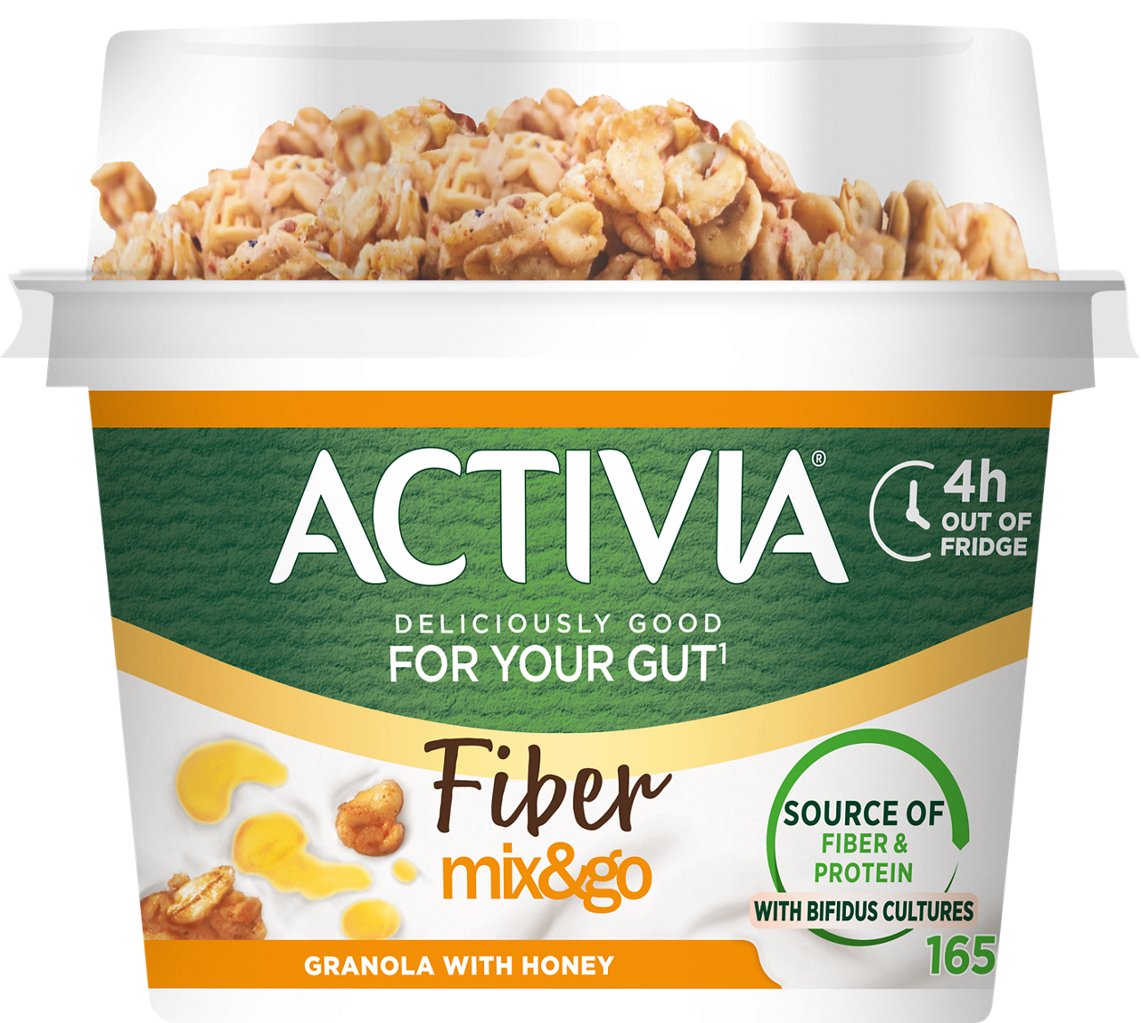 Aloita päiväsi hyvin Activia Mix & Go hunajagranolalla: Activian herkullisen täyteläinen rakenne yhdistettynä granolan rapeuteen ja hunajan makeuteen, unohtamatta Activia bifidobakteereja. Activia Mix & Go:n sisältämä kalsium tukee ruoansulatuksen normaalia toimintaa(1). Kätevä kertakäyttöpakkaus on valmiina antamaan hyvän alun päivääsi. Sekoita ja nauti ravitsevasta aamiaisesta liikkeellä ollessasi.Nauti missä vain haluat pakkauksessa mukana tulevan lusikan avulla! ACTIVIA Mix & Go maistuu parhaalta jääkaappikylmänä, mutta säilyy 4 tuntia jääkaapin ulkopuolella(2).