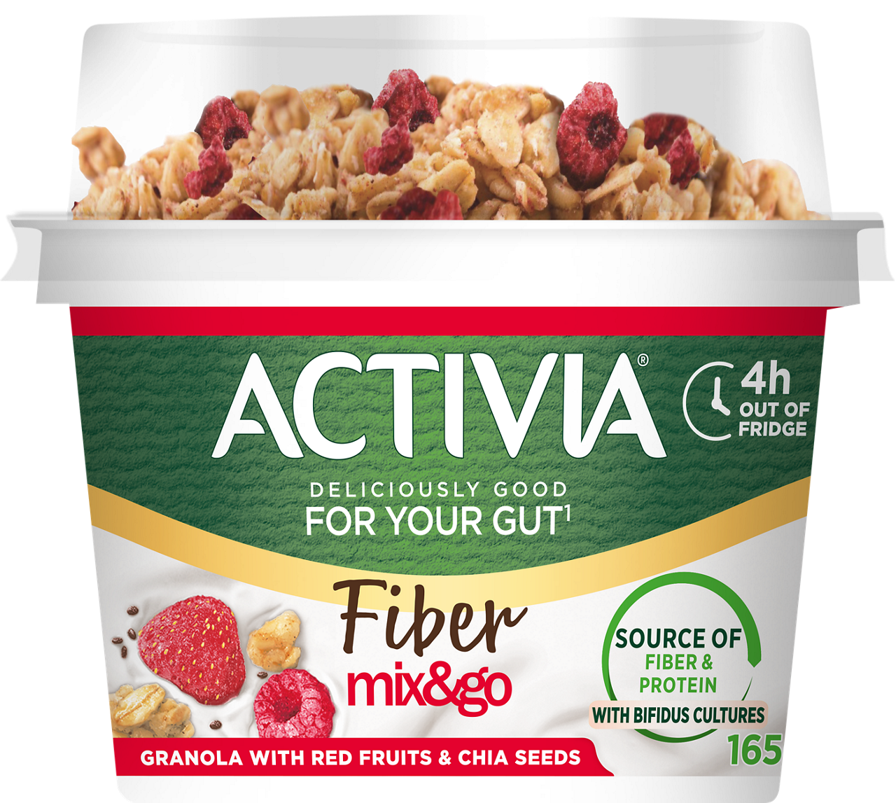 Aloita päiväsi hyvin Activia Mix & Go punaiset marjat granolalla ja chiansiemenillä: Activian herkullisen täyteläinen rakenne yhdistettynä granolan rapeuteen sekä vadelman ja mansikan makuun, unohtamatta Activia bifidobakteereja.