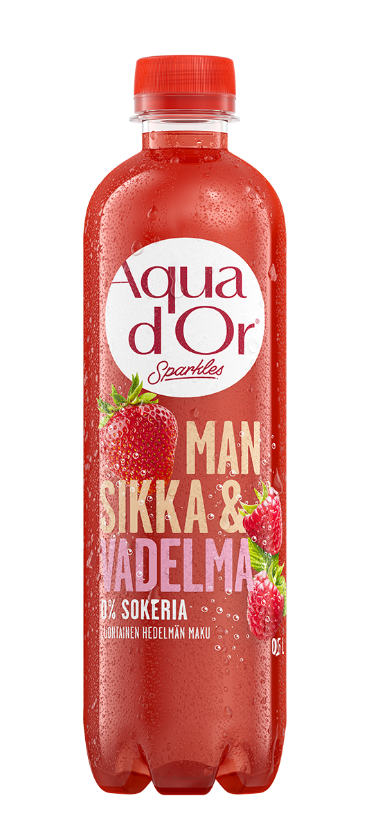 Ainesosat: Luontainen kivennäisvesi Aqua d’Or®-lähteestä, hiilidioksidi, happamuudensäätöaine (sitruunahappo), luontaiset värit (mustaporkkanatiiviste, sokerikulööri, bataattitiiviste, omenatiiviste), luontainen mansikka- ja vadelma-aromi ja muita luontaisia aromeja, säilöntäaine (kaliumsorbaatti), makeutusaineet (asesulfaami K, sukraloosi), stabilointiaineet (arabikumi, puuhartsien glyseroliesterit), aromi./ Ingredienser: Naturligt mineralvatten från Aqua d’Or®-källan, koldioxid, surhetsreglerande medel (citronsyra), naturliga fargämne (svart morotskoncentrat, sockerkulör, sötpotatiskoncentrat, äppelkoncentrat), naturlig jordgubbs- och hallonarom med andra naturliga aromer, konserveringsmedel (kaliumsorbat), sötningsmedel (acesulfam K, sukralos), stabiliseringsmedel (gummi arabicum, glycerolestrar av trähartser), arom.